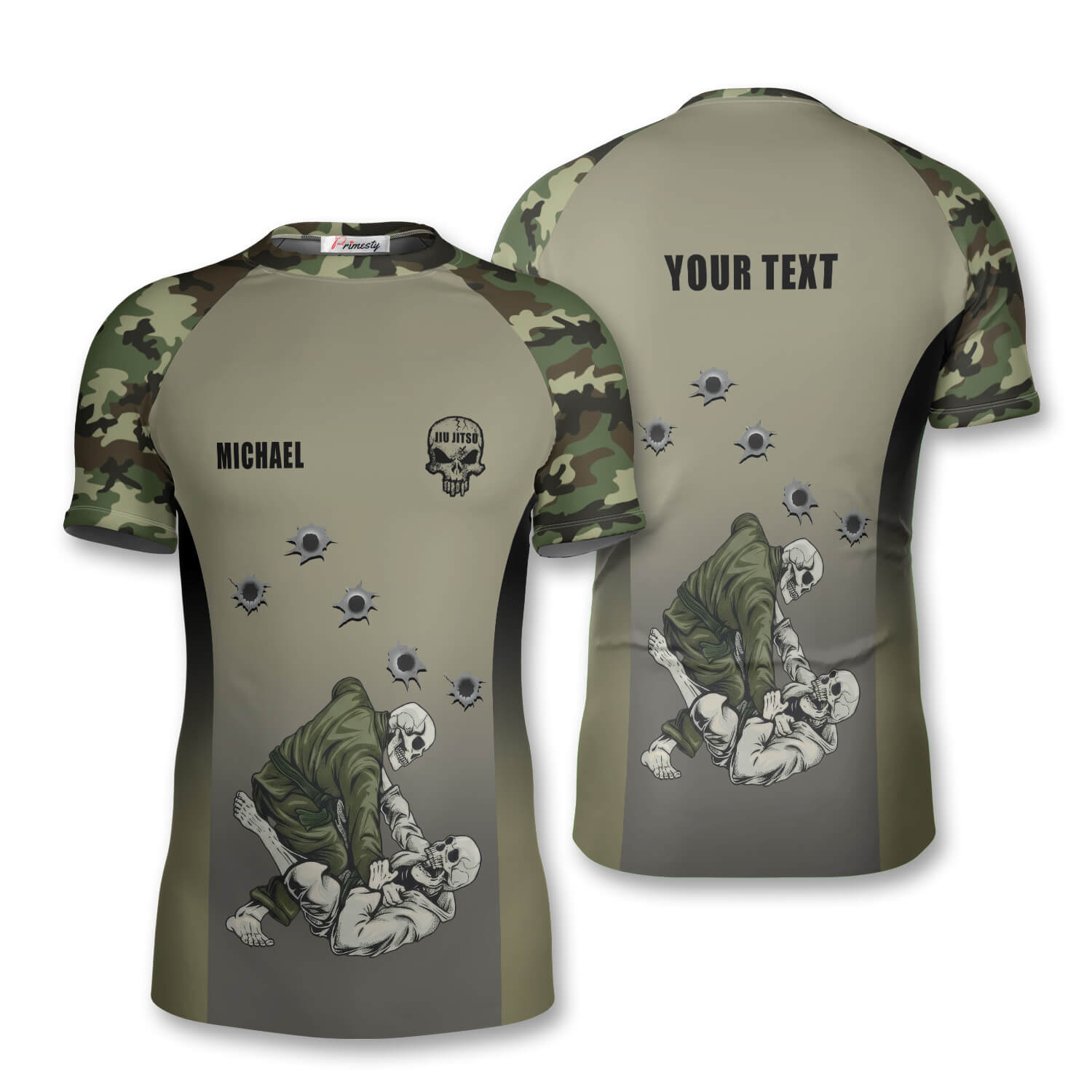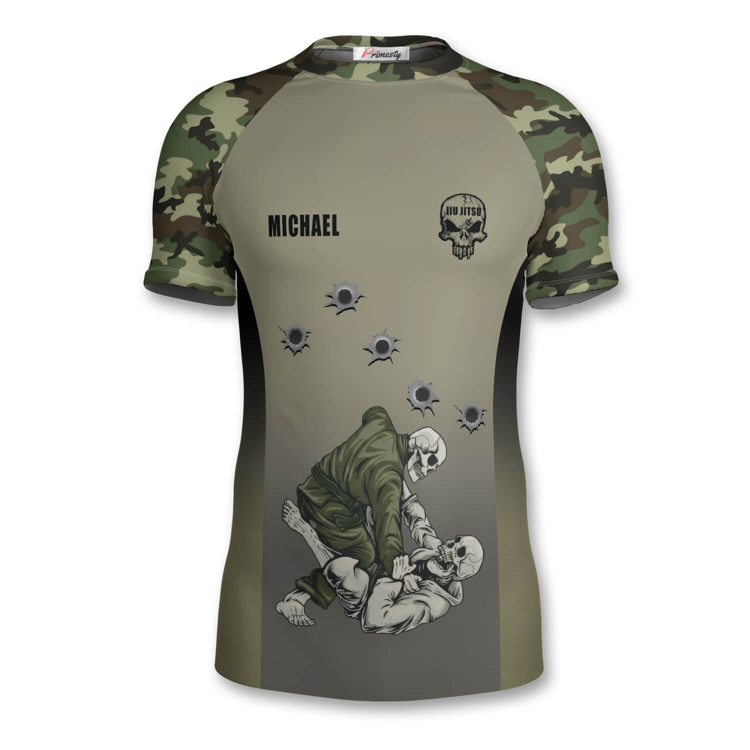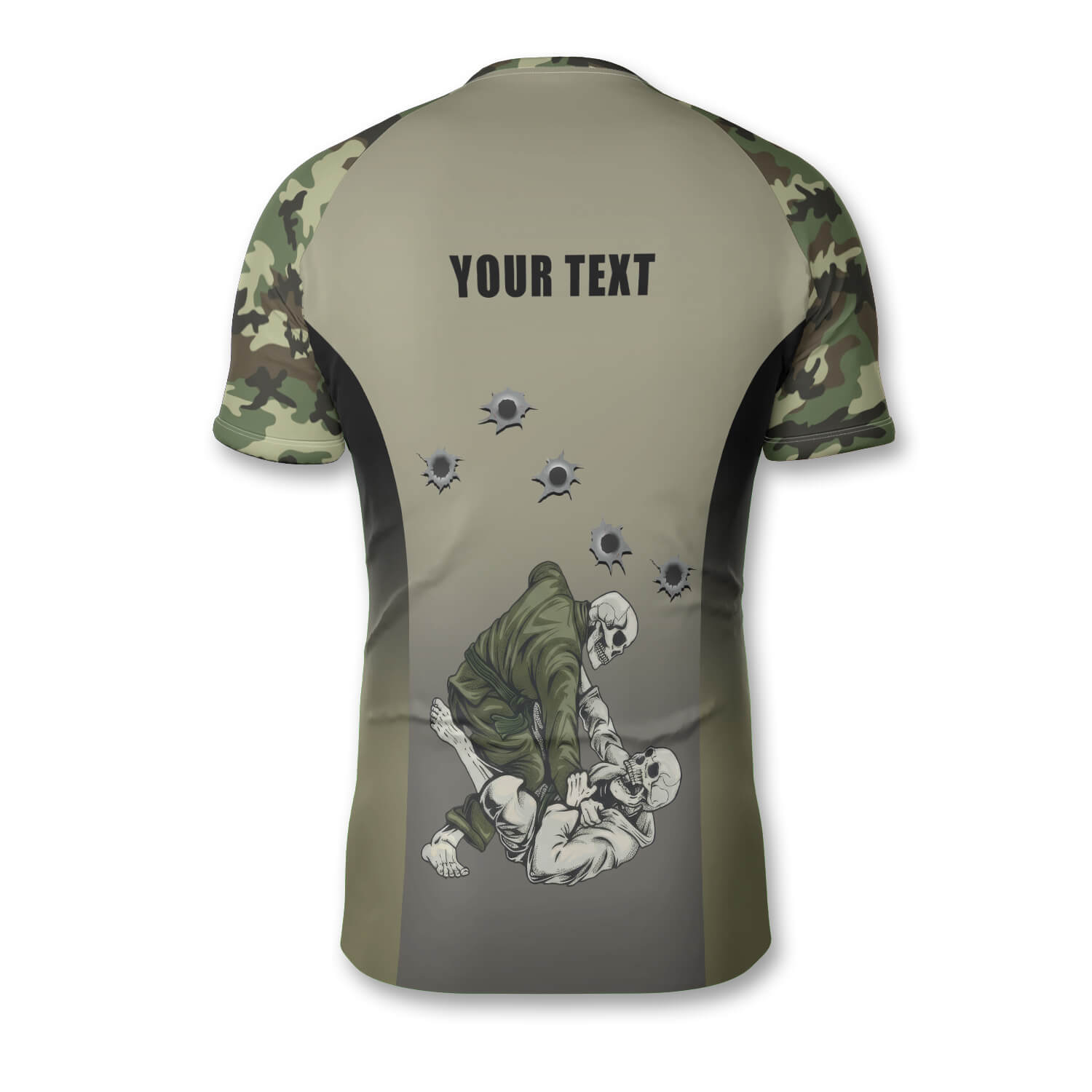 Green-Camo Gun Holes Skull Custom Brazilian Jiu Jitsu Rash Guard